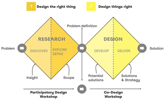 To deliver robust and strategic findings, the double diamond approach was utilised. The double diamond is a framework that helps designers and non-designers tackle complex social, economic, and environmental problems [106]. This approach facilitates an ideal work culture to provide robust and long-lasting positive change (The Design Council [107]). Therefore, by conducting two workshops, the double diamond framework can be utilised more thoroughly and produce in-depth findings, as shown in Figure 5.