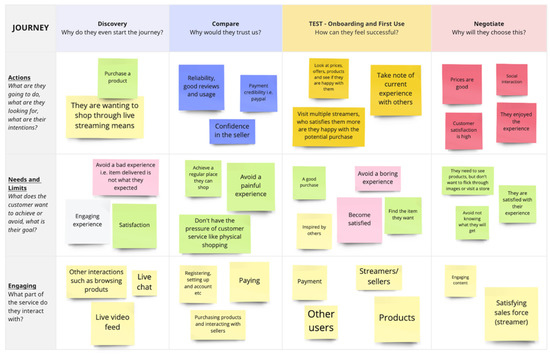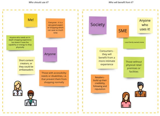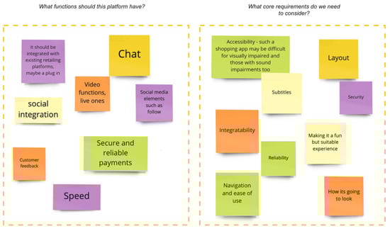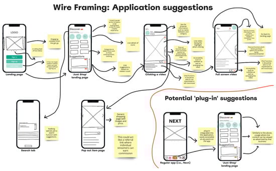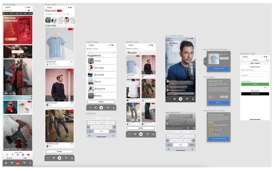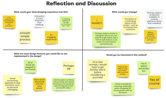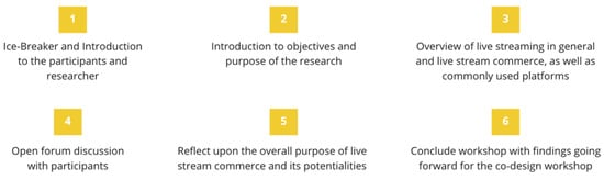 In conjunction with the PD workshops, co-design workshops have been utilised. The purpose of selecting co-design is because this method of practise allows users to become active members and part of the development of an application by allowing them to interact with ideas, the design, and the research team, allowing them to become the designers themselves [87]. This will enable the researcher to draw and gather strategic insights into how potential users want to use an application that involves live stream commerce. The areas that were investigated in this workshop were the following: 1. As a researcher/designer, be with participants to develop and design a live streaming application, inclusive of UX and UI aspects (paper prototypes, i.e., Figma, Miro); 2. Gain observational feedback based on the above (i.e., observing the behavioural and interaction aspects of individual participants) to generate feedback and develop strategic design insights.