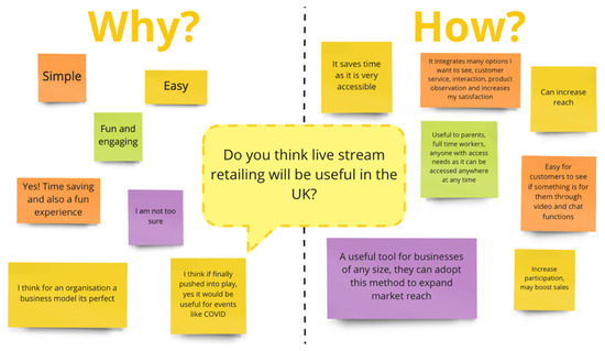 As part of the questionnaire, the researcher included the option to take part in a workshop. This will engage previous respondents in an open forum discussion to gain key insights into how they perceive live streaming in general, their understanding of it and so on. This method is extremely beneficial to this project, as it offers an HCI approach and various methods that enable alternative ideas to be developed, tested, and utilised [87]. These workshops are aimed towards the multiple perspectives we can gain from potential users. The PD workshop will allow stakeholders involved to voice their opinions in the decision-making process through its democratic approach. The key areas that were investigated in this workshop were the following: 1. Allowing participants to familiarise themselves with live streaming from the following three perspectives: the Chinese business model of Taobao, functionality, and usability; 2. Discussing and expressing opinions on how participants perceive the use of live stream commerce; 3. What are their suggestions to push this forward as a method of e-commerce?