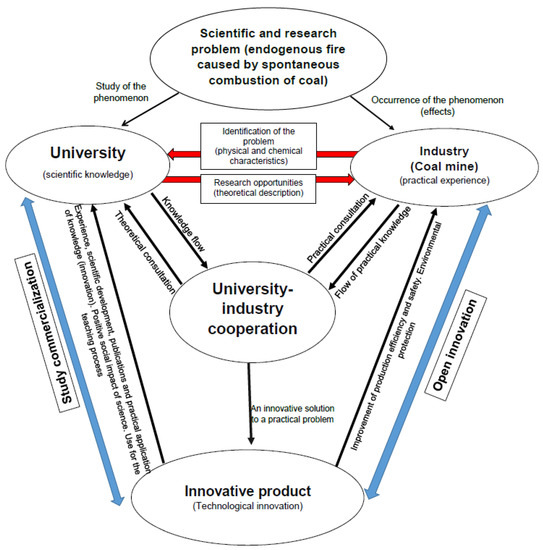 Growing competition in the education economy has caused companies to look for new innovative solutions that can increase their competitiveness. These processes practically concern the whole world, and the development of new technologies that are related to the concepts of Industry 4.0 and sustainable economy has accelerated innovation even more. In order to adapt to these trends, companies are taking extensive measures to apply new technologies and implement innovative solutions. The use of an open business model that is based, for example, on the concept of open innovation (OI) could be helpful in this process. By reinforcing their own solutions with external ideas and proposals and by cooperating on joint projects, companies have the chance to maintain beneficial relationships with customers and remain competitive. This also applies to the mining industry, for which the production processes are additionally affected by the natural hazards that are associated with the environment in which these processes are carried out. This article presents a relevant example of using the OI concept to develop and implement an innovative method for reducing the fire hazard that is caused by the spontaneous combustion of coal in underground coal mines. The method was based on the model tests that were conducted by the Silesian University of Technology. Since the mining enterprise in question was looking for an external solution to the problem of the formation and development of endogenous fires, it was open to cooperation. The open exchange of knowledge and ideas resulted in the development of an innovative method that was successfully applied in this coal mine. This paper presents a model for the cooperation between a research unit and an enterprise that included the open exchange of knowledge, which significantly enriched both sides of the project. It also discusses the innovative solution that was developed, which involved the use of model tests to identify potential locations for underground fires and an installation to supply certain substances to these areas in order to limit the occurrence and development of these fires. The results of the research, which confirm the effectiveness of the developed method, are also presented. The application of the IO concept and the cooperation between scientific research and industry made it possible to solve a specific and current problem that has a significant impact on the efficiency of the production processes of mining companies. The implementation of the developed method prevented an endogenic fire, and the mining process proceeded without any major disturbance. The developed solution and the applied model of open cooperation between a research unit and industry could together create the possibility of generating innovative solutions that can be quickly commercialized and implemented. Thus, the concept of OI presents a great opportunity for the development of an innovative knowledge-based economy.
