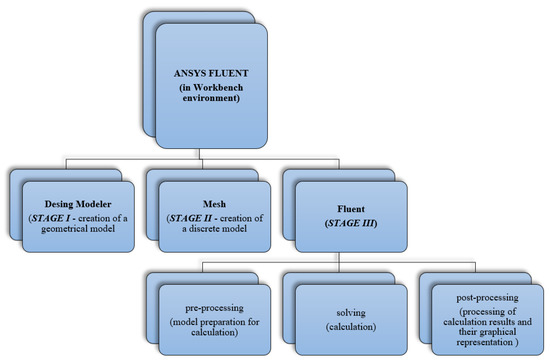 The process of building this model consisted of three parts (Figure 3): the construction of a geometrical model as well as the discretization and creation of a mathematical model. The process of creating a mathematical model is preceded by defining unambiguous conditions and involves the selection of a model characterizing the fluid flow (e.g., turbulent or laminar flow), the identification of material properties of gases (and also solids), the assignment of values for initial conditions (based on roof rock strength tests), and boundary conditions (based on ventilation measurements).