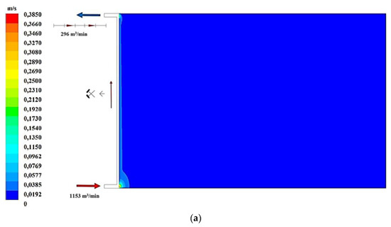 Figure 5 shows the distribution of air velocity (Figure 5a) and the velocity considered dangerous due to the fire hazard caused by the spontaneous combustion of coal (Figure 5b). The distribution of oxygen concentration in the air flowing through the longwall goaves at a distance of 2.0 m from the bottom of the exploited seam is presented in Figure 6.