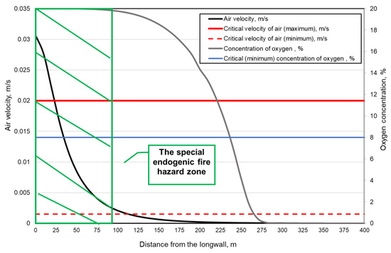 On the basis of the air velocity distribution and the oxygen concentration in the air flowing through the longwall goaves, a fire hazard zone was determined. The range of this zone is presented in Figure 7 and Table 2.