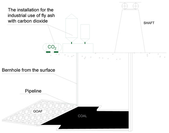 The identification of a zone in which there is a possibility of an endogenous fire led to further actions related to the reduction of this threat. These activities were undertaken by specialized mine services. They involved supplying the ash-water mixture with inert gas (carbon dioxide) through a network of underground pipelines. The mixtures were prepared on the mine surface in a specially designed and constructed installation. A general scheme of a technological line for preparing and administering appropriate mixtures to the endangered zone is shown in Figure 8.