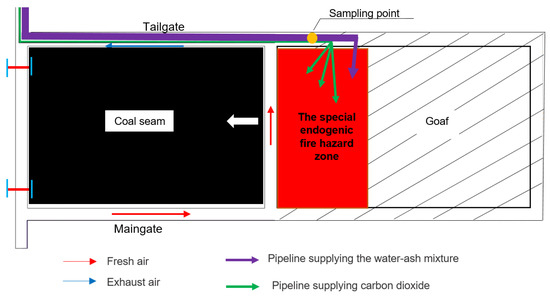 A diagram of the examined region with the location of the fire hazard zone and the manner of administering the neutralizing mixtures is shown in Figure 9. In this diagram, when defining a zone of a potential threat of an endogenic fire, the initial section of the goaf (directly behind the casing) was taken into consideration, which, due to the incubation time, should be regarded as a neutral zone.