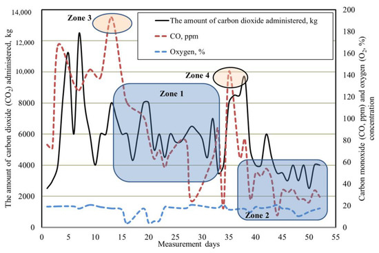 Figure 10 presents the time changes of carbon monoxide (CO) and oxygen (O2) contents in the mine atmosphere and the amount of carbon dioxide (CO2) supplied at that time as inert gas to the goaves. In this diagram, zones (1 + 2) with a distinct decrease in carbon monoxide concentration due to prophylactic measures are marked. There are also zones (3 + 4) with momentary increases in concentration, which decreased with time and an increase in the amount of supplied inert gas.