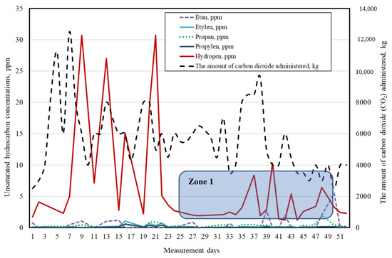 Time waveforms of unsaturated hydrocarbon concentrations in the mine atmosphere were also determined for the same test time (Figure 11). The recorded changes proved that the coal heating process was reduced, which is particularly visible in zone 1.