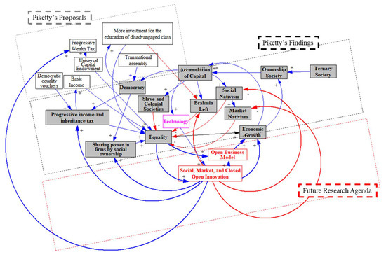 Causal loop modeling of Piketty’s findings and proposals for future research on open innovation dynamics. Additional explanation: Grey colors are Piketty’s proposals; Black colors are Piketty’s findings; Red colors are ‘future research agenda’; “+” means positive feedback; “-” means negative feedback.