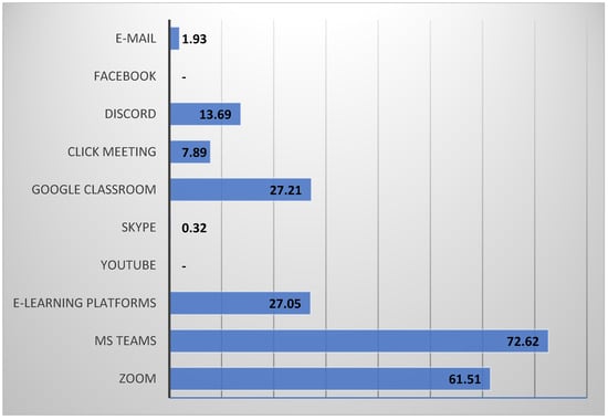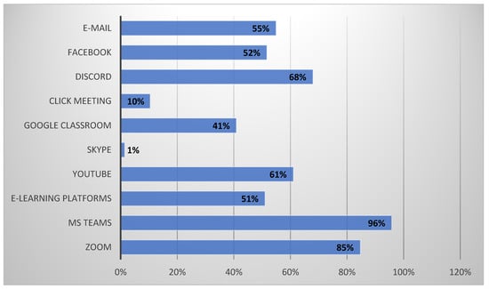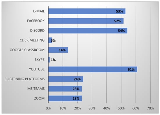 Based on the results, it was concluded that before the pandemic, students mainly had knowledge of services for transmitting/sharing content in the form of videos, photos, and other materials, as well as for communication. More than half of the respondents showed knowledge of using YouTube (61%), Discord (54%), e-mail (53%) and Facebook (52%) in e-learning. Innovative e-learning tools allowing for synchronous or asynchronous communication with students and conducting classes via the Internet were known to slightly more than 20% of students—this applies to tools such as Zoom, MS Teams and e-learning platforms used by universities.