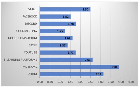 Research shows that the most frequently used e-learning tools during the COVID-19 pandemic have been communication platforms, mainly for videoconferencing. Such innovative e-learning tools enable full, synchronous conducting of classes (lectures, exercises, projects) via the Internet on similar principles as in the case of traditional classes. The highest number of respondents indicated the use of MS Teams (3.9 on a 5-point scale) during classes, while Zoom was in second place (3.14). Tools for the use of asynchronous learning methods, such as modern and innovative e-learning platforms (2.61) and the classic tool such as email (2.5), were also often used.