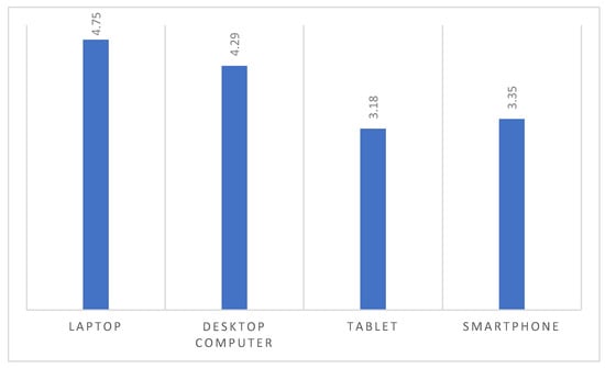Research shows that the most commonly used e-learning device is a laptop. Most of the respondents found it very useful in e-learning—the usefulness score was 4.75. A desktop computer turned out to also be a very useful device in this regard. Its usefulness in the field of e-learning was assessed slightly above the high level—4.29. The usefulness of other devices, such as tablets (3.18) and smartphones (3.35), was assessed at an average level.