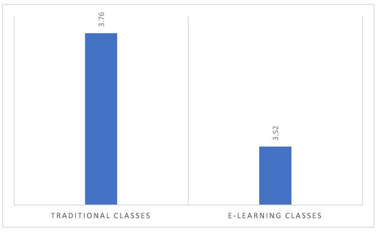 Figure 6 presents a comparison of traditional and e-learning activities in teaching. Respondents were asked to rate the ease of content acquisition in the case of traditional and e-learning classes. Ratings were made on a scale of 1–5, where 1 means that the content is very difficult to digest, and 5 is very easy.