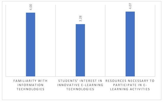 The analysis of the papers connected with the e-learning widespread in university [26,27,28,29,39,40,101,103,104] give an insight that the knowledge of the student about information technology and the access to resources can have an impact on e-learning usage. However, those were only suppositions, and what is more, there was no paper with the proper correlation analysis about the relation between these factors and the effectiveness of e-learning usage. Additionally, because e-learning is an innovative solution, it was supposed that the interest of students in the usage of innovative e-learning technology could also affect the effectiveness of e-learning. Another group of questions referred to the knowledge of and access to appropriate technology. They consisted of the following aspects: