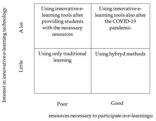 The paper presents the results of the research on the influence of the COVID-19 pandemic on the dissemination of innovative e-learning tools in higher education. Research was carried out in Poland in December 2021 on a sample of 621 students. The main issue that was the subject of the author’s analysis was the influence of the COVID-19 pandemic on the change in the use of innovative e-learning tools in university education. After conducting the research and discussing this and related research about e-learning during the pandemic, it was concluded that the percentage of students familiar with the analyzed e-learning tools has increased significantly during the pandemic. There has been a visible rise, especially in the usage of the following tools: MS Teams, Zoom, and Google Classroom. The most frequently used e-learning tools during the COVID-19 pandemic have been mainly videoconferencing tools such as MS Teams and Zoom. However, students also have used e-learning platforms and e-mails. The author’s research identified three hidden factors (categories) of the used e-learning tools. They include the following categories: popular services and applications adapted to e-learning; popular applications for synchronous meetings adapted to e-learning; and other synchronous and asynchronous e-learning methods. The familiarity with information technology, as well as an interest in innovative e-learning tools, have positive influence on the ease of acquiring content in e-learning. Having the proper resources also positively influences the absorption of e-learning content. On the basis of the achieved results, the authors prepared a model of relations between students’ interest in innovative e-learning technology and the resources they possess to participate in e-learning classes. This model enables us to assess which method—e-learning, traditional or hybrid—should be used in the given situation. The developed model can be useful for universities. They can assess the students’ interest in innovative e-learning technologies and their level of technical resources using questionnaires and on this basis divide students into groups to prepare the optimal learning way—e-learning, traditional or hybrid.