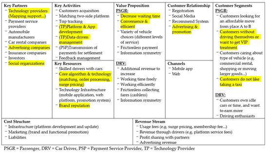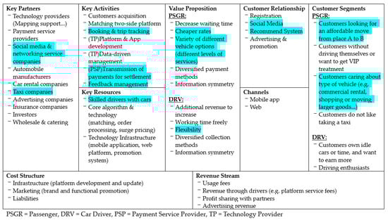There are not many studies that apply the canvas model to ride-hailing services such as Uber and DiDi. However, a few studies apply the canvas model to mobility as a service (MaaS). For example, [31] presents several types of sustainable open business models in the MaaS market using the canvas model. Among various kinds of MaaS alternatives, open innovation is shown to be the most difficult in the case of car-sharing operators, which are the closest to the subject of this study. As we will present below, we could draw some reasons for these findings by comparing and analyzing the canvas BMs of Uber and DiDi. For example, MaaS operators need to provide greater availability and flexibility for the potential users to increase the chance of success. Our study also confirms that DiDi was ahead in this dimension over Uber (refer to Section 3.1.1 and Section 3.1.2).