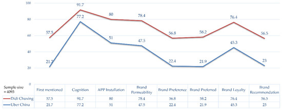 It is generally known that DiDi’s victory in the Chinese market was driven by aggressive investment and marketing strategies. Indeed, DiDi spent USD 4 billion a year trying to weaken Uber’s market share and finally managed to dominate 80% of China’s ride-hailing market in 2016. As a result, in a 2016 survey, when both platforms were competing, 77.2% of passengers said they were aware of the brand name of Uber China, while 91.7% said they were familiar with the DiDi brand [8]. The relatively high user awareness of the DiDi brand naturally led to more recommendations of the brand. In China, users’ preference for Uber came mostly from brand loyalty (45.3%), the first-choice rate (21.9%), and brand preference (22.4%) [8]. However, these figures were much lower than those of DiDi.