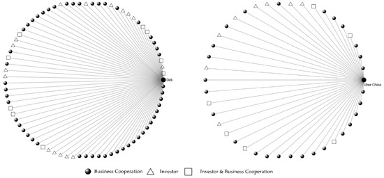 In order to compare the structural characteristics of collaborations and the diversity levels of participating industrial sectors in the two platform ecosystems, major institutions that had investment or business relationships with these platforms (from 2014 to 2016) were investigated and summarized in the following diagrams. The partnership networks centered on the two platforms are demonstrated below in Figure 7.