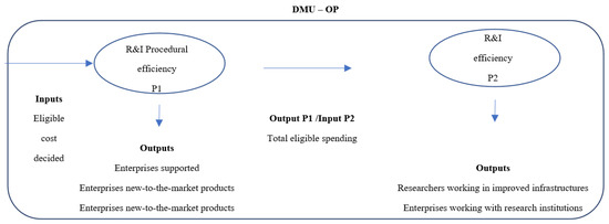 In addition, according to [41], at the TO level, 2014–2020, common R&I indicators concentrate on financial aspects (e.g., financial resources assigned), which are always present at any stage, and on procedural aspects (e.g., ‘the number of enterprises receiving support’). Nevertheless, there are other indicators, referred to as real outputs, such as the ‘number of researchers working in improved research infrastructure facilities’ and the ‘networks created between enterprises and research institutions facilitating technological and knowledge transfer’ [41]. Therefore, we have considered an NSBM model with the structure given in Figure 1.