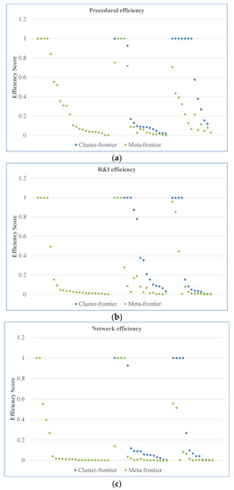 A TGRk closer to one indicates a tiny gap between the meta- and the cluster-frontier. The meta-frontier indicates the underlying efficiency level of the entire assessed group of DMUs, whereas the cluster-frontier depicts the true efficiency level of each cluster; the greater the value of TGRk, the narrower the gap between the meta- and the cluster-frontier.