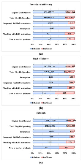 In this regard, our work is novel in four ways: (1) It proposes the usage of the Network Slack-Based Measure (SBM) DEA model in conjunction with cluster analysis to appraise 53 Operational Programmes (OPs) from 19 EU countries dedicated to fostering R&I in SMEs; (2) It separates efficiency analysis into two stages: the procedural efficiency, mainly concerned with OPs’ implementation, and the potential R&I capacity generation obtained with the funds spent; (3) It makes it possible to assess this sort of funding across the programming period, allowing for the implementation of policy actions to address detected inefficiencies, thus offering supplementary evidence that can be useful in the intermediate monitoring phases of the OPs. (4) It addresses the diverse regional characteristics of the OPs, according to the most recent regional development NUTS2 categorization, which was used to allocate the ERDF for the 2014–2020 programming period. Therefore, it considers less developed regions (GDP lower than 75% of EU GDP), regions of transition (GDP lower than 90% and higher than 75% of EU GDP), and more developed regions (GDP higher than 90% of EU GDP), which are categorized into three separate clusters.