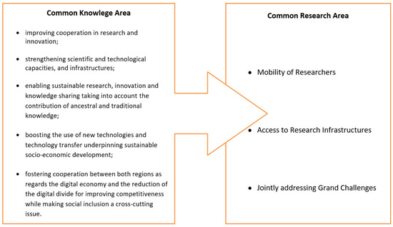 With regard to bi-regional STI cooperation, which is the first item listed in the EU–LAC Action Plan, the transition from the EU–LAC Knowledge Area in 2004 to the Common Research Area (CRA) in 2015/2016 narrowed down the scope of STI cooperation from five to three strategic pillars, namely increased mobility, access to research infrastructures, and jointly addressing common challenges (Figure 1).