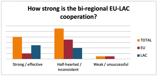 Interestingly, the majority of the respondents from LAC believe that the cooperation is strong/effective, followed closely by those who believe it is half-hearted/inconsistent. No respondent from LAC classified the bi-regional cooperation as weak/unsuccessful. The approval rate is lower when considering the participants from the EU, of which the majority believes that the cooperation is half-hearted/inconsistent, and only 17% of the EU respondents believe the cooperation is strong/effective.