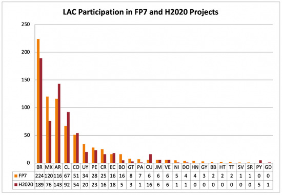 As Figure 3 shows the participation of LAC countries in FP7 (2007–2013) and H2020 (2014–2020), some interesting points can be noticed. In the first place, the overall participation shows, at the moment, a decline in overall LAC participation, of approximately 10%.