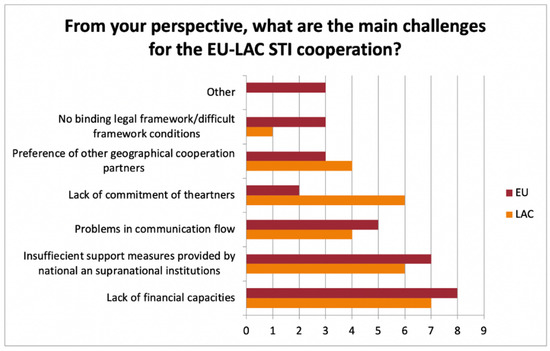 Regarding, the second-most-frequently chosen challenge, insufficient support measures provided by national and supranational institutions, survey participants believe that one major deficiency in EU–LAC STI cooperation is a lack of political commitment from both regions, and they, therefore, call for a long-term binding framework and plurennial commitments.