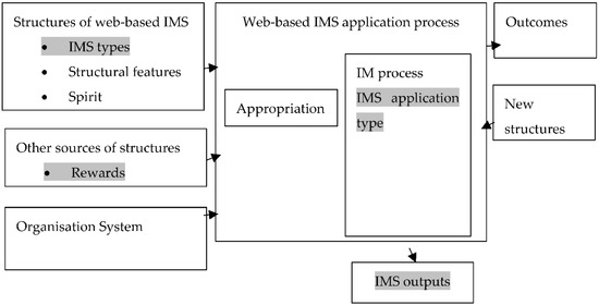 Theory Gap: There are theories about rewards and the adaptation of different information management systems, but in this paper, the authors will try to fill a gap identified in the literature review—how the adaptation of different reward mechanisms influences results based on the IMS application type (see in Figure 3. An adaptive structuration theory (AST) is considered an appropriate theoretical framework for this study, as it could reveal how structures and systems interact and present the results. AST states that the technology application by an organisation is determined by several forces: the technology, the organisational systems, the task and the way structures emerge and update in the appropriation process [23]. From the start, AST has been used to study decision systems, and it is a strong theoretical framework that can be used to study other more advanced information technologies [24], such as web-based IMS. Although AST provides the framework to understand the interaction between systems and structures, there is little evidence on how specific ICT tool applications may affect results associated with structures [25]. Here, the structures will be web-based IMS application types, focusing on outputs related to idea quality and idea quantity, while the rewards will be the systems that will interact with the structure (See Figure 3).