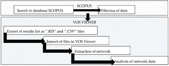 The role of reward systems in innovation is a well-researched field according to the number of papers in the scientific database Scopus—with over 1427 articles at the time of this research. Authors have started the analysis of publications with an initial data collection through the search of pre-defined terms: TITLE-ABS-KEY (Innovation rewards) AND (LIMIT-TO (SUBJAREA, “BUSI”) OR LIMIT-TO (SUBJAREA, “SOCI”)). It means the author limited the literature research to the social sciences and business management journals. The search results were filtered and then the refined results were used for further network analysis. The network analysis provides qualitative scientific explorations with a focus on publication correlations and their impact on the publisher network. In the network analysis, keywords in the titles were appraised. The initial search was conducted in the Scopus database to collect the publications for network analysis. For the network analysis, the visualisation tool VOSViewer was applied. It is effective at clustering and visualising data, and therefore, it is used for the network presentation of keyword correlations [51]. The whole procedure is visible in Figure 5.