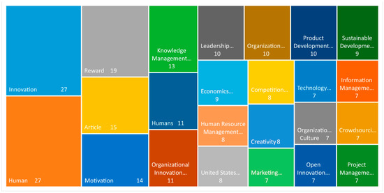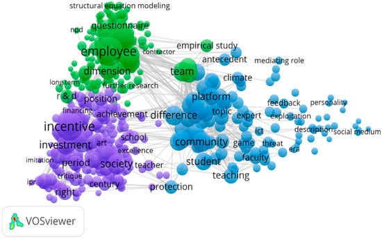 The system of linked keywords is represented as a network. The colours point to the clusters in which most of the keywords of a group occur together. The size of the node shows the connection degree of the keywords. A total of 509 keywords included three clusters, 55,492 links found, and a total link strength of 142,980. As seen, the most affiliating keyword is “employee”. This is also the most connected keyword in its cluster with the terms “team”, and “dimension”. The second-largest node is the keyword “incentive”. The third is “platform” and “community”. For the Scopus database, the main keywords show other words (see Figure 9) for example: “innovation”, “human”, “reward”, “motivation”, and “knowledge management” can be explained by the meaning of the network analysis—not the frequency but the weighting of the connections is emphasised.