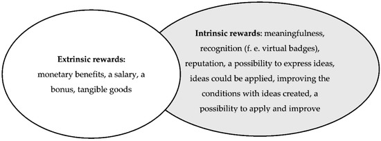 Rewards in IM are more important for idea creator motivation than anything else [52,53,54]. There are different rewards, for example, extrinsic rewards (compliance-based), such as monetary benefits, a salary, a bonus or commission. In this research, extrinsic rewards are defined as financial rewards. In contrast, there are intrinsic rewards (purpose-based), such as joy, meaningfulness, recognition, reputation, etc. In this paper, intrinsic rewards are defined as non-financial rewards. These types of rewards could be also defined as tangible and non-tangible ones [55]. See Figure 10.