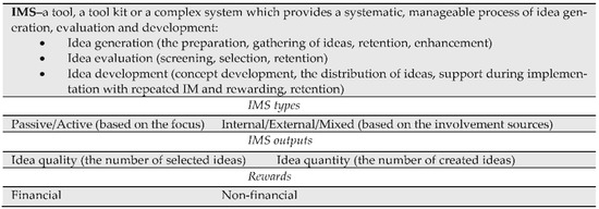 The paper is built on the assumption that IMS is a tool, a tool kit or a complex system which facilitates IM, while IM is a systematic and manageable process of idea generation, evaluation and the repeated idea generation and evaluation if it is needed [42]. There are different web-based IMSs available on the market. The authors apply two classifications of IMS as IMS application types: based on a task focus and on an involvement focus.