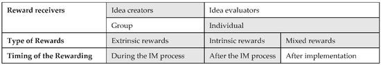 The rewards could be distributed at the different stages of the process: participants could be rewarded directly after the selection or after the successful implementation of the idea [65], but also during the process of IM itself.