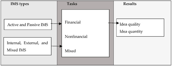Web-based IMS are applied by many well-known and globally recognised organisations, such as Panasonic, Virgin, Sony, Fujitsu, Volvo, NASA, European Commission, etc. There is an abundance of cases that prove the positive effects a web-based IMS can have on an organisation’s performance [19]. In practice, during the IM process, enterprises often face several challenges when it comes to managing idea generation, evaluation and other management aspects of IM [20,21]. Although there is a great variety of web-based IMS and has shown they are successfully applied by well-known organisations, the situation that was described in a legendary publication Capturing the Complexity in Advanced Technology Use: Adaptive Structuration Theory by DeSanctis and Poole (1994) is still topical, as both the developers and the users of these information management systems see the potential of these systems. However, positive results rarely occur consistently because of the way organisations adopt these systems [22]. In this research, the authors will contribute to closing this gap by answering the following question: What types of rewards have to be applied to achieve better results, and in this case—what rewards lead to a higher idea quality and quantity? See Figure 2.
