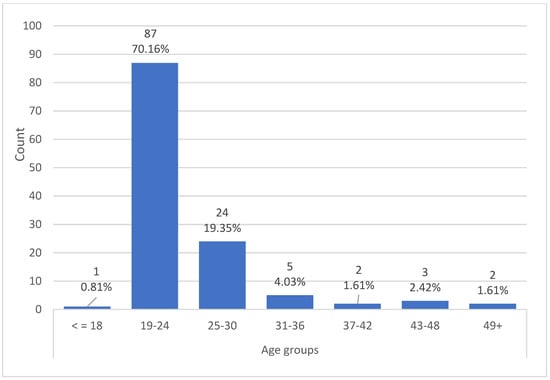 The survey had a total of 124 respondents, out of which, 70 were female (56.5%), 53 were male (42.7%), and one respondent identified themselves as other (n = 1). Thus, the genders in the study are rather equally distributed.
