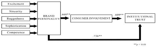 The scales were tested for reliability using Cronbach’s α. The recommended value of Cronbach’s α is 0.7 [44], and the brand personality dimensions proved to be reliable with Cronbach’s α, ranging from 0.721 to 0.885. The consumer involvement scale proved to be reliable, with a Cronbach’s α of 0.872. The institutional trust scale proved to be reliable, with a Cronbach’s α of 0.825 (Table 3). Table 3 demonstrates that all the values meet the recommendations for construct reliability.