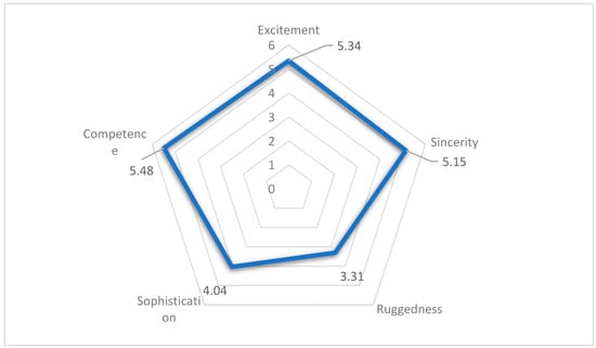 This study further investigated the perceived brand personality of Airbnb. Figure 4 depicts the brand personality dimensions of Airbnb according to respondents’ ratings: excitement (M = 5.34), sincerity (M = 5.15), ruggedness (M = 3.31), sophistication (M = 4.04), and competence (M = 5.48). Thus, excitement, sincerity, and competence are the brand personality dimensions that are perceived by the respondents to be most strongly associated with Airbnb.