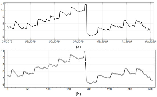 Figure 2a shows the dynamics of daily cash balances in the 2019 federal budget TSA (trillion rubles) after the procedure for accounting for working days in Russia that year and their further alignment. In 2019, there were 254 calendar working days in Russia. These data are unevenly distributed throughout the year; therefore, the standard uniform alignment procedure was applied using the Time Series Resample function from the Wolfram Mathematica library, resulting in 355 points (time steps, where one time step in this model is (365/355) = 1.028 calendar days) that were distributed evenly throughout 2019 (Figure 2b).