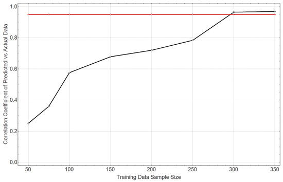 The forecasting procedure for 55 time steps ahead was repeated for sample sizes from 50 to 350 points to analyze the dependence of the forecasting accuracy on the number of training points. The correlation coefficient between predicted and actual values was calculated (Figure 3). This figure illustrates the sensitivity of the (55-point) forecasts based on the wavelet packet transform to the sample size (number of training points): the calculated correlation coefficients are shown on the vertical axis, and the sample size is shown on the horizontal axis. As shown in Figure 3, the wavelet-based forecasting procedure works best for large samples comprising more than 300 training points (time steps).