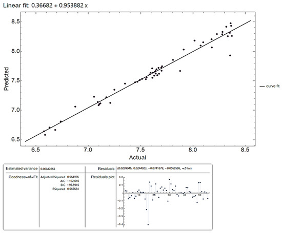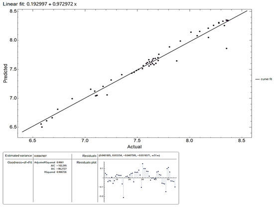 Figure 5, Figure 6 and Figure 7 provide more detailed graphical information for each analyzed DW [3.1] and DW [8.8] forecasting model. In particular, Figure 5 shows the result of the correspondence (correlation) between the actual and predicted values of the analyzed time series after the first iteration based on the DW [3] transformation. As shown in Figure 5, the forecasting accuracy is at R2~0.965 (96.5%).