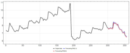 Thus, it is quite difficult to choose favor of one of the forecasting models, DW [3.1] or DW [8.8], from the results of the adequacy tests since the DW [3.1] forecasting model is more consistent with the real dynamics of the time series proceeding from the information criteria. On the other hand, the DW [8.8] forecasting model is more consistent, proceeding from the higher values of the determination coefficient. In general, both models accurately make it possible to forecast possible changes in the time series under consideration (accuracy exceeds 96%).