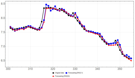 Figure 8 shows the correspondence between the actual values of the time series, corresponding to serial numbers from 301 to 355, and the predicted values obtained through the DW [3.1] and DW [8.8] transformations.