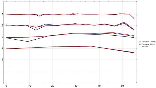 When testing the hypothesis (H3), Table 1 shows that the DWT time series decomposition level affects forecasting accuracy. As follows from Table 1, after ranking according to the AIC and BIC indicators, the forecasting model based on the DW [3] transformation after the first iteration of application (DW [3.1]) is preferable since it is characterized by the minimum values of AIC = −102.616 and BIC = −96.5945, and rather high values of Adj-R2 = 0.96498 and R2 = 0.9656. However, after ranking by R2 and adjusted R2(Adj-R2), it can be seen that the forecasting model based on the DW [8] transformation after the eighth iteration of application (DW [8.8]) is more accurate than other forecasting models of the analyzed time series. The DW [8.8] forecasting model is characterized by maximum values R2 = 0.967 and Adj-R2 = 0.966 and competitive values AIC = −102.295 and BIC = −96.273.