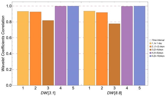 Figure 10 shows the numerical values of cross-wavelet correlations between the actual values of the analyzed time series and the predicted values obtained through the DW [3.1] and DW [8.8] transformations at five scale levels.