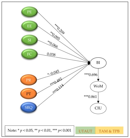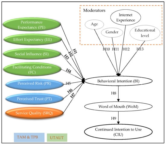 Age into five groups, gender into two groups, educational level into four groups, and Internet experience into three groups, seen in Table A1. The constructs effort expectancy (EE) and performance expectancy (PE), each measured by four items derived from [6] cited from [72]. Social influence (SI) measured by three items derived from [6] cited from [72]. Facilitating conditions (FC) measured by four items derived from [6] cited from [72]. Perceived risk (PR) measured by four items derived from [40]. Perceived trust (PT) measured by four items derived from [40]. Service quality (SRQ) was measured by three items derived from [6]. Behavioral intention (BI) measured by three items derived from [40]. Word of mouth (WoM) measured by four items derived from [80]. Continued intention to use (CIU) measured by six items derived from [85]. All measurements are shown in Table A1. Next participants and collection procedure are presented.