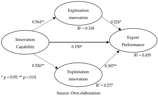 Given the values presented in Table 5, the VAF value of exploration innovation—(0.126)/(0.126 + 0.150) = 0.457—indicates that it partially mediates the relationship between innovation capabilities and export performance. The same is true for exploitation innovation capabilities—(0.209)/(0.209 + 0.150) = 0.582. Finally, the combined effect of exploration and exploitation innovations—(0.335)/(0.335 + 0.150) = 0.691—partially mediates the relationship between innovation capabilities and export performance.
