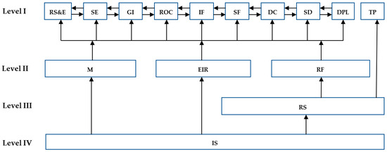 Using Algorithm 1, each driving factor is assigned a level in the proposed hierarchical structure. The assignments are described in Table 5. It shows that 10 driving factors are positioned in Level 1, while only institutional support is assigned to Level IV.