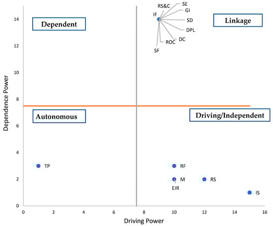 Step 10. Analyze the driving power and the dependence power. As an extension of the ISM, the MICMAC analysis evaluates the driving power and dependence power of the elements. By constructing a map, they are classified into four clusters: