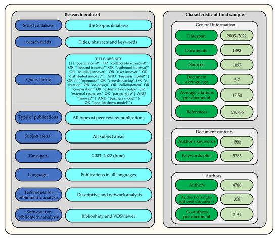 In the second step, search query words were identified and the data required for the bibliometric analysis were collected. It was decided that the searched keywords would be combinations of ‘business model’ and different terms related to open innovation. Therefore, apart from ‘open innovation’, additional searched keywords included ‘collaborative innovation’, ‘coupled innovation’, ‘user innovation’, ‘inbound innovation’, ‘outbound innovation’, and ‘distributed innovation’ [19,30,31]. Furthermore, the other terms related to open innovation such as ‘openness’, ‘crowdsourcing’, ‘co-creation’, ‘co-design’, ‘collaboration’, ‘cooperation’, ‘external knowledge’, ‘external resources’, and ‘partnership’ were explored [87]. Combinations of these key words using relevant Boolean operators were searched in title, abstract, and keywords. All types of peer-reviewed publications were taken into account in the primary sample. There were no restrictions regarding the publication period of the analyzed documents. However, due to the first publication in the BM&OI literature appearing in 2003, the analysis timespan was narrowed from 2003 to 2022. The data were retrieved on 1 July 2022 and a total of 2126 documents that met all of the specified criteria were found. The initial research sample was subjected to a screening process. The retrieved data were checked to assure that an English version of the title, abstract, or keywords were available for all publications, as well as to eliminate duplicate publications and erroneous entries (i.e., inconsistent with the research area under consideration). To avoid distorting the results of bibliometric analysis, publications with an undefined author were excluded. Furthermore, to ensure the high quality of the dataset, the following document types were eliminated: conference review, note, short survey, erratum, letter, and items published in trade journals. As a result, the final research sample of 1892 documents was obtained. A general description of the research protocol and characteristic of the final research sample is presented in Figure 1.